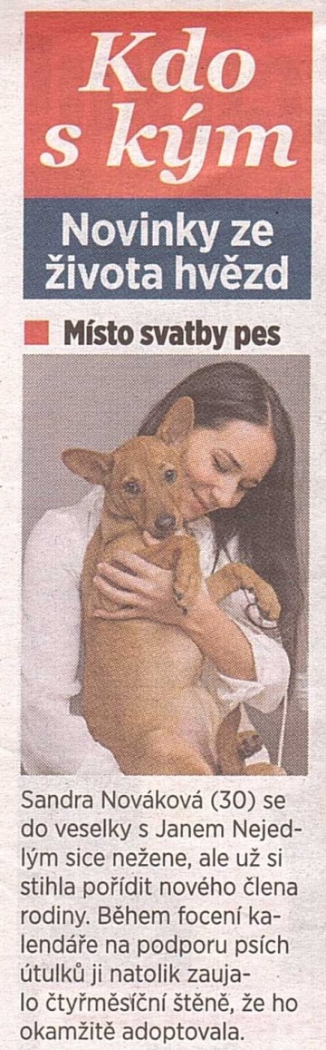 Když si některá známá osobnost osvojí zvíře z útulku, je to pak velká událost. Úžasná motivace pro další lidi, kteří nad adopcí uvažují. Jeden z našich svěřenců měl to štěstí si to zkusti na vlastní kůži.http://www.ahaonline.cz/clanek/zhave-drby/79655/sandra-novakova-ma-novou-lasku-jmenuje-se-bambi.htmlhttp://ordinace.nova.cz/clanek/novinky/sandra-novakova-adoptovala-fenku-bambie-z-psiho-utulku.htmlhttp://www.super.cz/16574-sandra-novakova-je-blaznive-zamilovana-objektem-jeji-lasky-ale-neni-snoubenec-honza.htmlhttp://revue.idnes.cz/sandra-novakova-si-vzala-z-utulku-psa-fenka-se-jmenuje-bambie-p5d-/lidicky.aspx?c=A121029_182216_lidicky_vedhttp://www.super.cz/146503-sandra-novakova-prisla-o-intimni-zivot-vime-kdo-za-to-muze.html