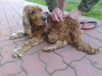 Anička je zhruba osmiletá fena kokršpaněla. Byla nalezena dne 19.4.2017 sražená autem ve Vraném nad Vltavou. Okamžitě byla transportována na veterinární kliniku k ošetření.