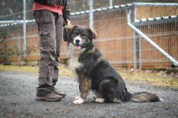 Béďa je mlaďoch, ještě mu není ani rok. Údajně má být kříženec bernského salašnického psa, chundelatostí a znaky by to i odpovídalo, velikostí ale odpovídá spíše borderce nebo australákovi (pro představu). Možná ještě malinko povyroste, ale maxipes z něj rozhodně nebude.