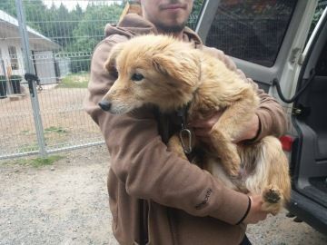 Právě jsme přijeli z odchytu této fenky, která se už dva dny zdržovala u jednoho stavení v Kozojedech na konci obce. Fenka je (téměř) slepá, má nádor v tříslech, vypadá staře i přes štěněcí vzhled (paradox co?). Úměrně nejistá k jejímu hendikepu, ale jinak mírná.
