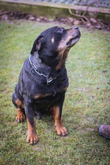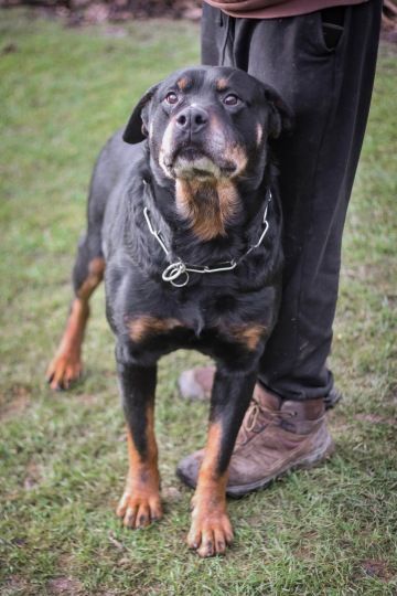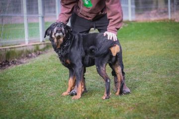 Bonifác je ztělesnění dobra a lásky v rotvajleřím těle. Je mu odhadem něco mezi 7-9 lety. I přes jeho telesnou schránku nás tu všechny ohromil jeho, dalo by se říct, canisterapeutickou povahou. Je to klidný pes, miluje nadevše lidskou společnost, drbání a mazlení. Při mazlení se o člověka opírá, aby ani centimetr jeho těla nezůstal ošizen o blahodárný kontakt s člověkem. U nás nám ukázal, že se umí chovat i k dětem, se kterými se tu doposud setkal. Ve výběhu je veselý, hopsací, uvrtěný a aktivní.