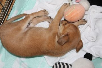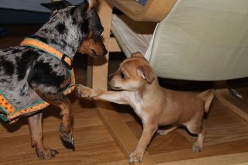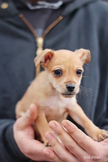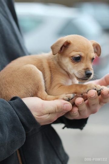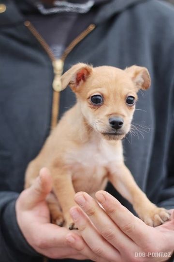 Čajda je zhruba sedmitýdenní kříženec malých plemen. Vypadá to, že se potkal pinč, čivava a možná i jorkšír.