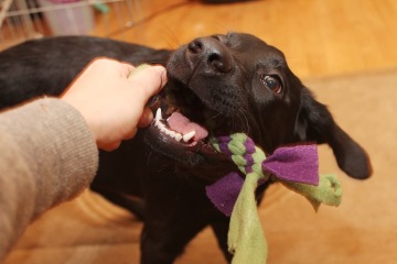je kříženec labradora a tudíž bude v dospělosti i podobně velká. Je to pětiměsíční štěně, aktivní, hravé, kontaktní, bez známek psychické újmy.