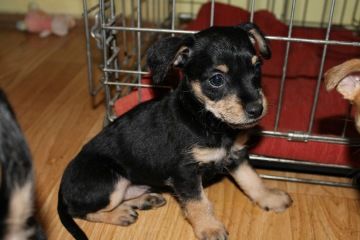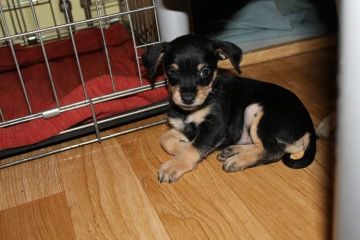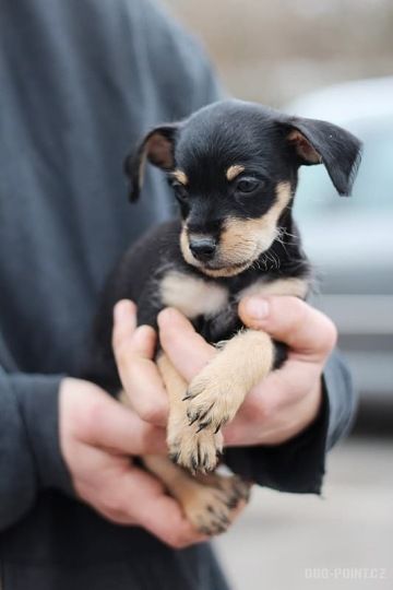 Čunče je zhruba sedmitýdenní kříženec malých plemen. Vypadá to, že se potkal pinč, čivava a možná i jorkšír.