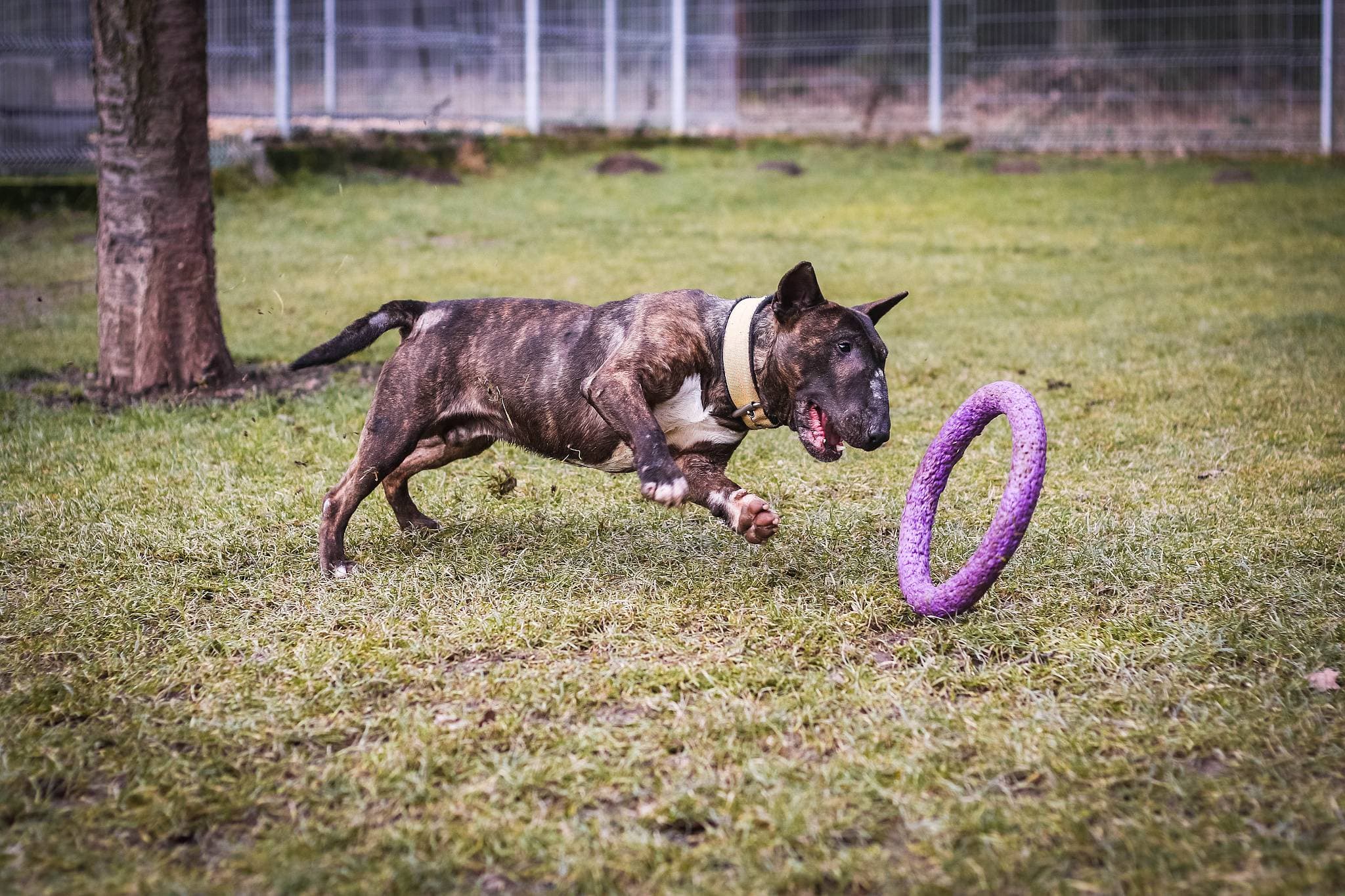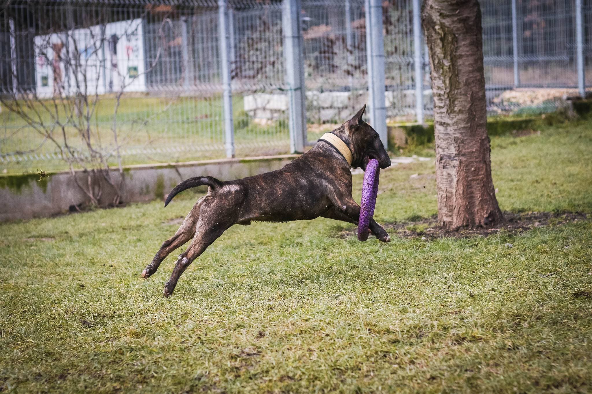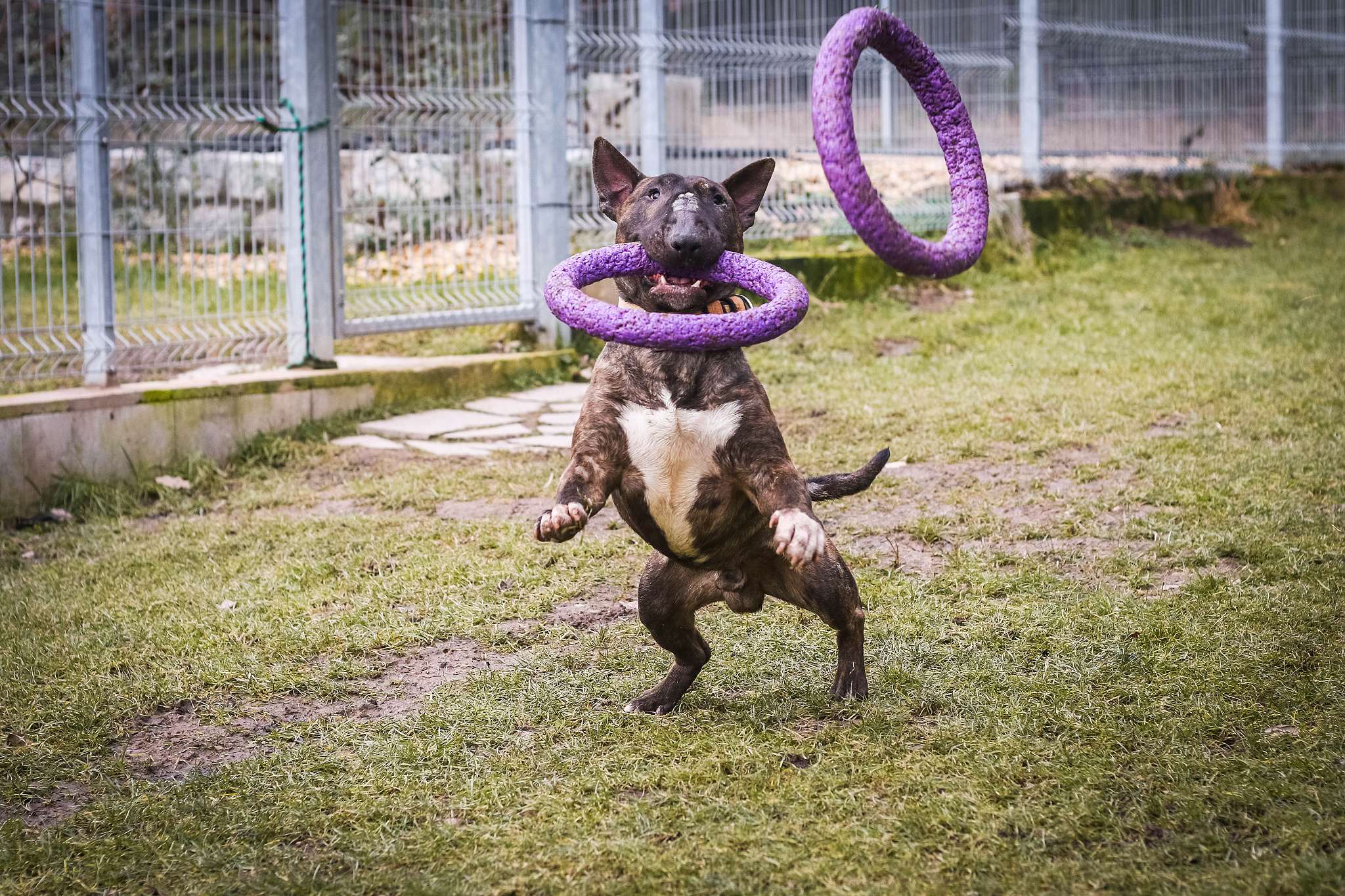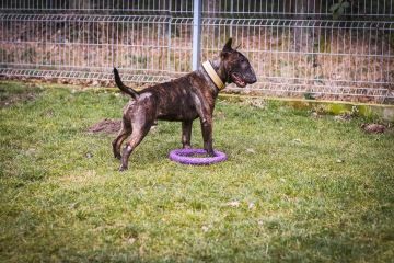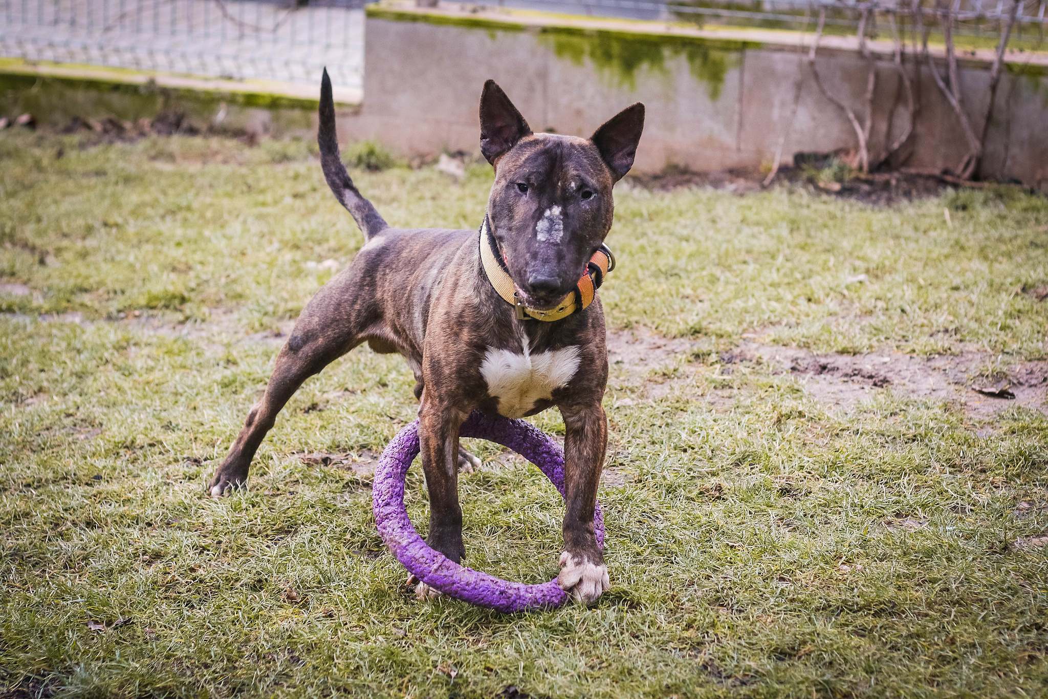 Pětiletý bullteriér. Malý neřízený tank. K lidem přátelský.