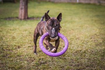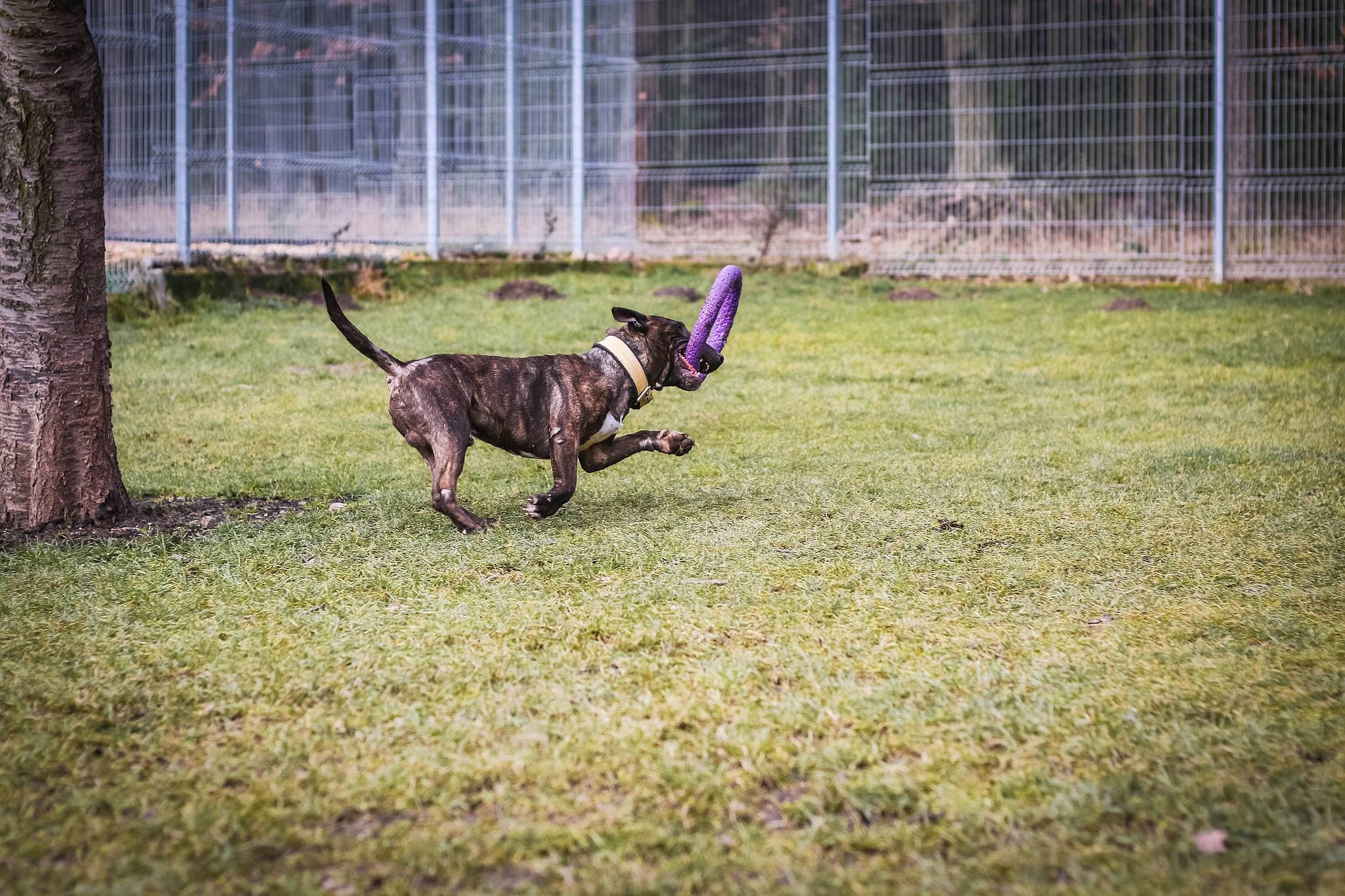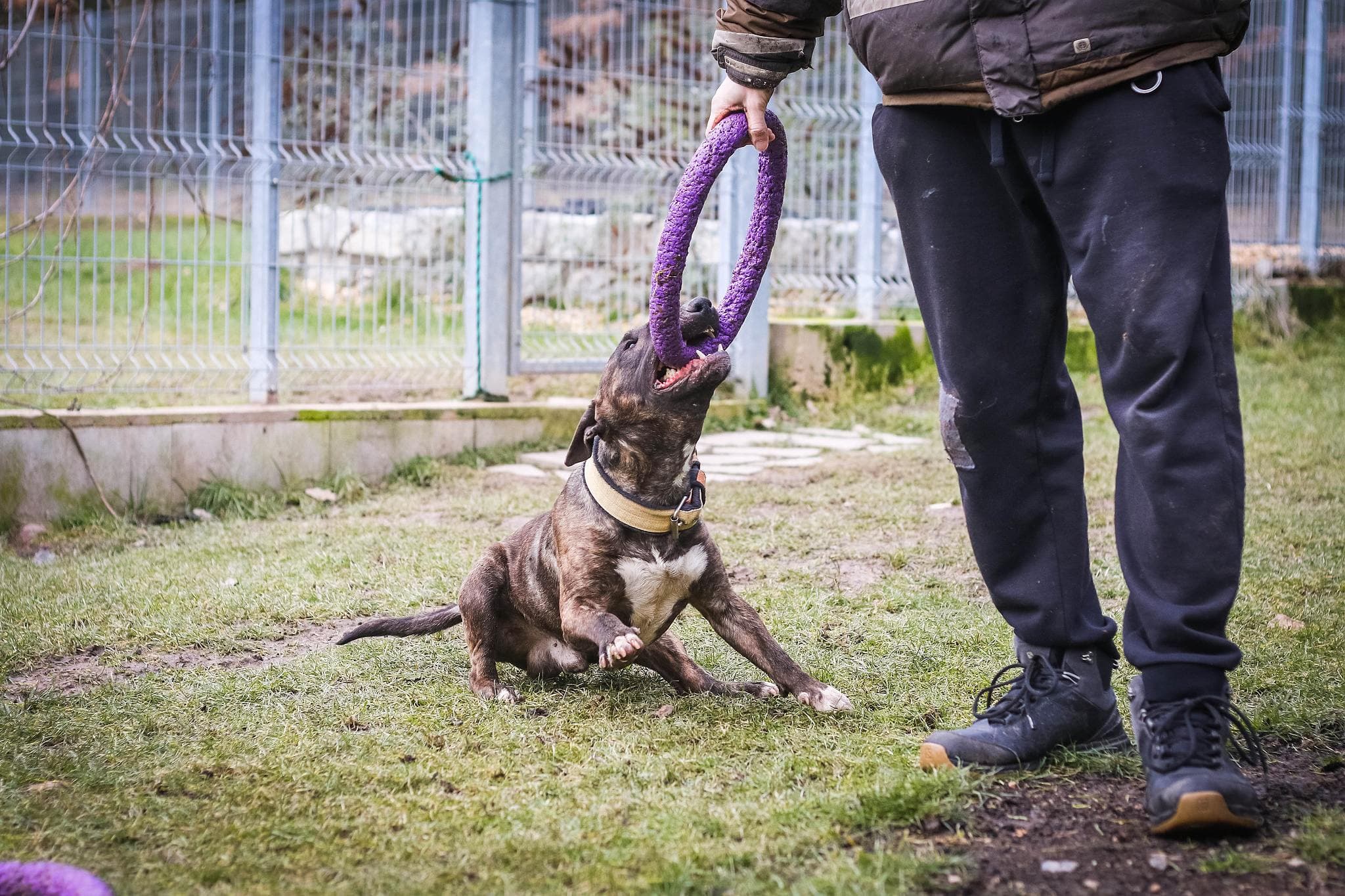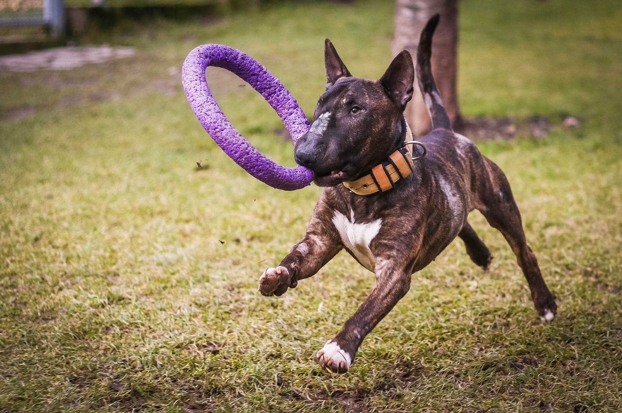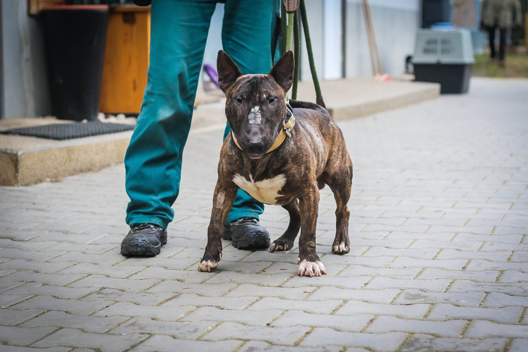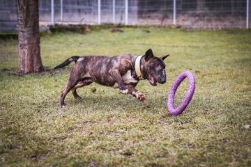 Pětiletý bullteriér. Malý neřízený tank. K lidem přátelský.