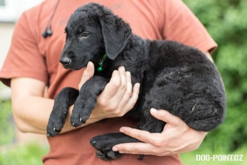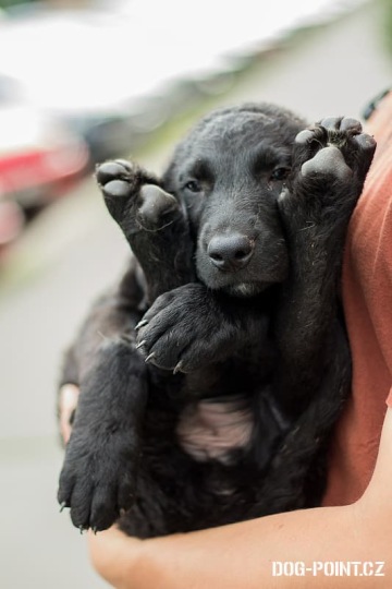 Dulík je dvouměsíční štěně, kříženec pravděpodobně curly coated retrívra. V dospělosti je tedy předpokládána velikost nad 20 kg. Ze všech sourozenců je největší a nejmohutnější.
