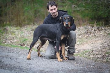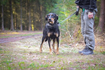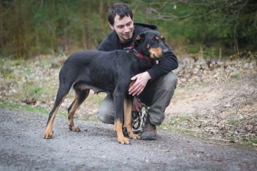 Je to asi 3-4 letá fenka, odhadujeme kříženec beaucerona a rotvajlera nebo dobrmana, která toho zatím v životě moc nezažila. Jen rození štěňat a podle toho také vypadá. Je ale neuvěřitelně přátelská k lidem, mazlivá, kontaktní. Zvyklá i na děti. S jinými psy vychází spíš individuálně (zpočátku na ně blafá). Sama je takové štěně ve velkém těle - miluje hry, pobíhání, hopsání. Reaguje na přivolání a to je asi tak vše z jejich výcvikových dovedností.