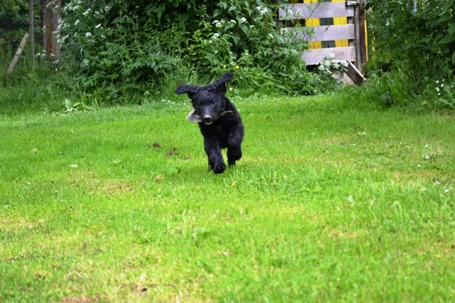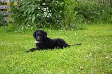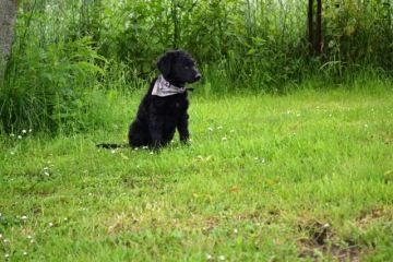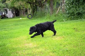 Kačka je dvouměsíční štěně, kříženec pravděpodobně curly coated retrívra. V dospělosti je tedy předpokládána velikost nad 20 kg. Jelikož je to fenečka, tak patří k těm drobnějším ze všech sourozenců.