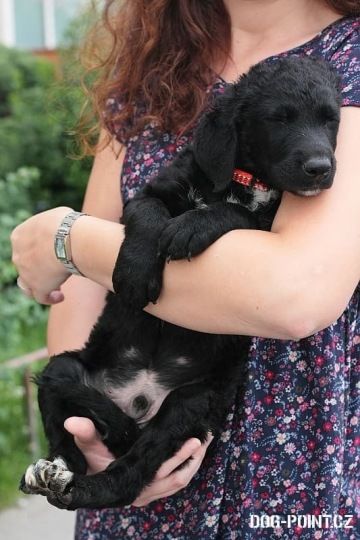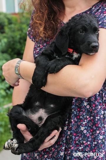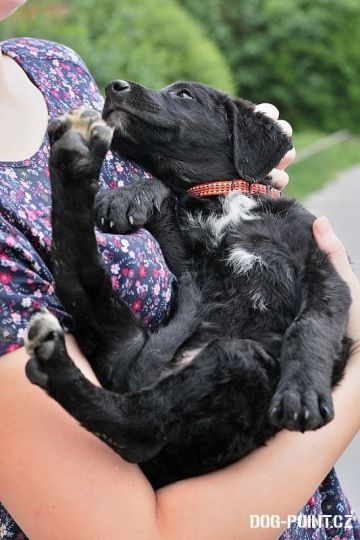 Je to aktivní a hravé štěně, zvyklé na společnost jiných psů. Je kontaktní k lidem. Jako každé štěně bude potřebovat naučit veškeré základy od domácí hygieny po slušné chování. Nenese si žádné výrazné trauma z předchozího života, má tedy dobré předpoklady vyrůst pod dobrým vedení ve fajnového společníka.