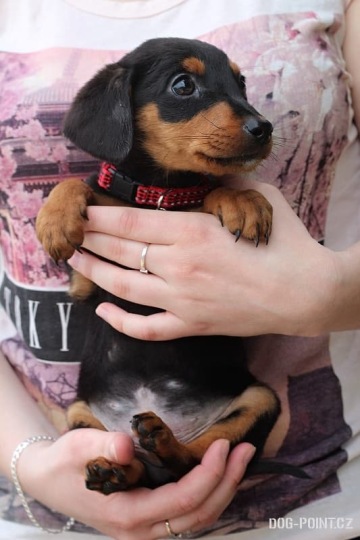 Je to malé štěně, které teprve objevuje svět. Prozatím je stále spolu se svými sourozenci a jako každé štěně si rád hraje a užívá si. Nemá naučené hygienické návyky. Je to velmi mladý pejsek, který toho moc nezná a teprve se začíná vše učit. Je tedy v ideálním věku pro odchod do nového rodiny a učení nových věcí.