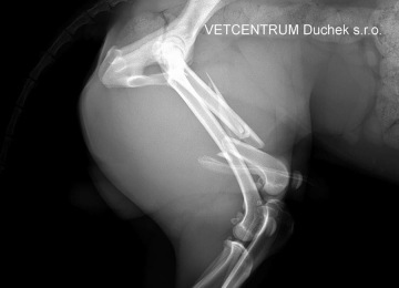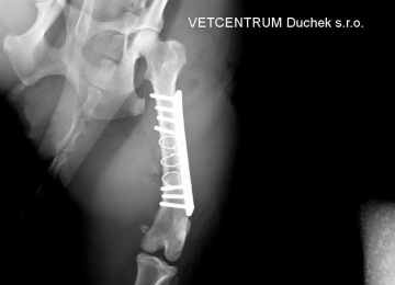 Maxíkova operace byla provedena v inhalační anestézii Isofluranem, před operací dostal Maxík nitrožilně antibiotika. Tříštivá zlomenina stehenní kosti, kde byly 4 fragmenty (úlomky), byla řešena nejprve fixací největšího fragmentu ke kosti dvěma cerklážemi a pak přemosťující ploténkou se sedmi šrouby. Cílem bylo zachovat osu končetiny, funkčnost kyčelního a kolenního kloubu a přiblížit úlomky co nejvíce ke kosti. Jak je vidět na pooperačním RTG snímku, krásně se to podařilo. Max bude brát ještě týden ATB, léky na bolest dle potřeby a modřina vzniklá během úrazu se mu bude mazat Heparoidem. Další RTG jsou plánovány 3-4 týdny po operaci. Zlomenina srůstá po operaci obvykle 6-8 týdnů.