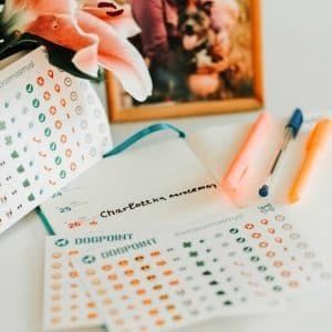 Zase jsou to týdenní A5 diáře v koženkových, Dogpointích modrých deskách, a nechybí ani veselé samolepky, které oživí každičký zápis.