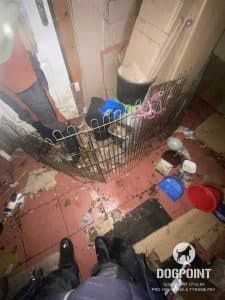 Téměř 50 psů bylo ve strašně páchnoucích prostorách plných výkalů, které nikdo minimálně nějakou dobu neuklízel. Neměli přístup k vodě ani krmení. Už na první pohled bylo zřejmé, že psi jsou ve špatném stavu, jsou obaleni výkaly, mají přerostlé drápy. KVS začala okamžitě jednat a podala podnět k odebrání všech psů, k čemuž také došlo. Bohužel jednomu psu již nebylo možné pomoci a přivolaný veterinář ho musel na místě uspat. Také pro další 4 psy (2 dospělí a 2 štěňata) už bylo pozdě - na místě je našli již mrtvé.
