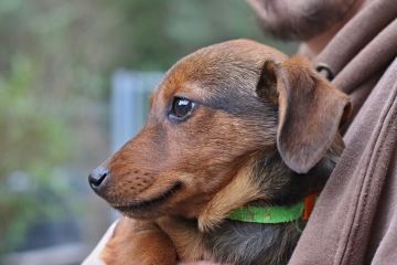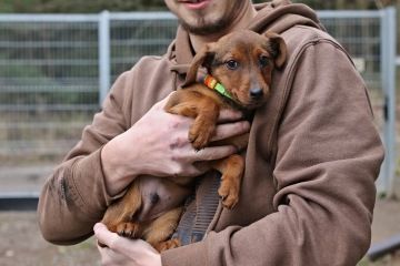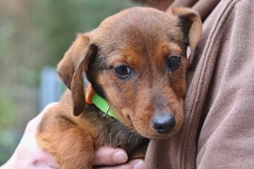 Zhruba 4 měsíční psí kluk. Věk odhadujeme podle toho, že se mu už mění pomalu mléčné zuby. Jedná se o křížence jezevčíka, tak v dospělosti předpokládáme spíše menší vzrůst. Aktuálně váží kolem 3 kg.