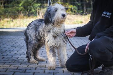 Pupík je zhruba čtyřletý pes, nápadně připomínající bearded kolii. Je o něco menší, váží necelých 20 kg. Moc toho neumí, ale zvládá chůzi na vodítku dokonce tak bravurně, že se nezamotává vodítkem o každou překážku. Zpočátku je nejistý z cizích lidí a nových situací, ale po krátké době je velmi kontaktní a přátelský. Pokud má možnost se dostatečně vyvenčit, je čistotný.