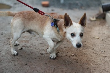 Rex, starší kříženec jezevčíka. Je slepý, ale jeho hendikep ho nijak neomezuje. Je to aktivní, přátelský a vyrovnanýpes. Miluje společnost lidí a má hygienické návyky.