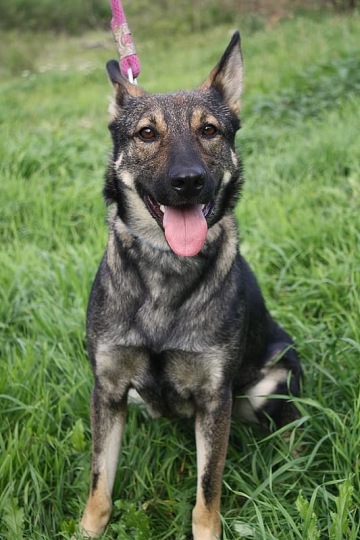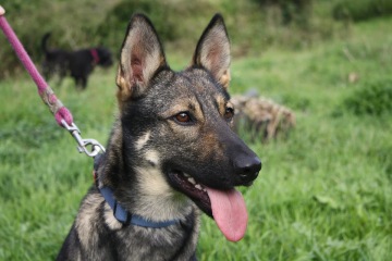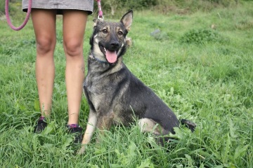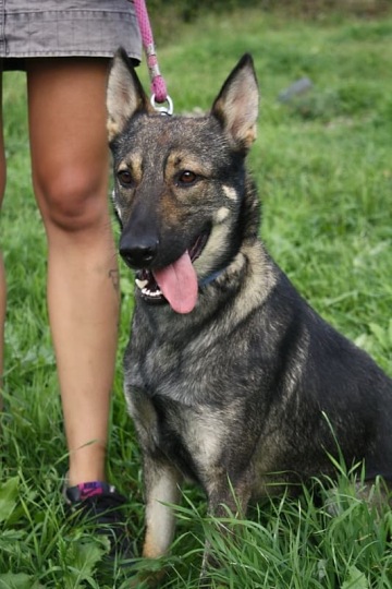 Ria je velmi milá a mladá fenečka, cca do dvou let věku, čemuž by odpovídaly i její pěkné bílé zoubky. Je to kříženec vlkošedého ovčáka, nicméně je menší než klasický ovčák. Na vodítku je velmi radostná, skáče, tahá, ale při pozornosti sedí jak sloup a nechá se opečovávat. Umí pár základních povelů a je nekonfliktní, s jinými psy se skvěle snáší, k lidem je také velmi kontaktní. Potřebovala by aktivní páníčky, či domeček se zahrádkou. Je velmi tvárná a výcvik by jí velmi mentálně stimuloval - to z ní pak bude naprosto perfektní společník.