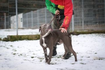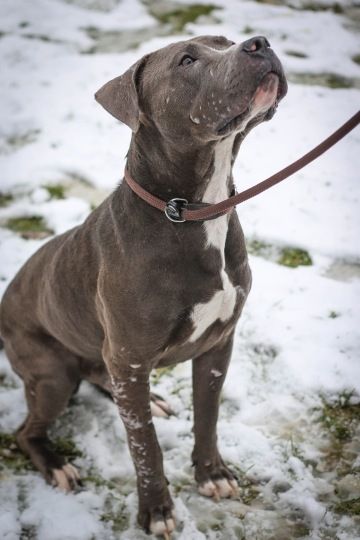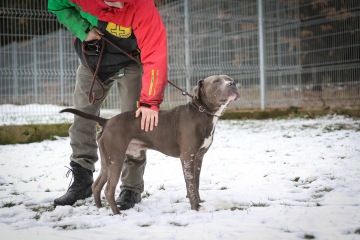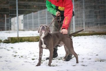 Robin je mladý pes, předpokládáme že maximálně kolem dvou let. Má vizáž amerického staforda. K lidem je přátelský, je to takový ťunťa a trouba. Není problém s ním manipulovat a ošetřovat ho. Nic moc toho neumí, ale je to přeborník ve vymazlování a dožadování pozornosti. Myslíme si, že nebude mít problém ani s rozumnými dětmi. Má hygienické návyky.