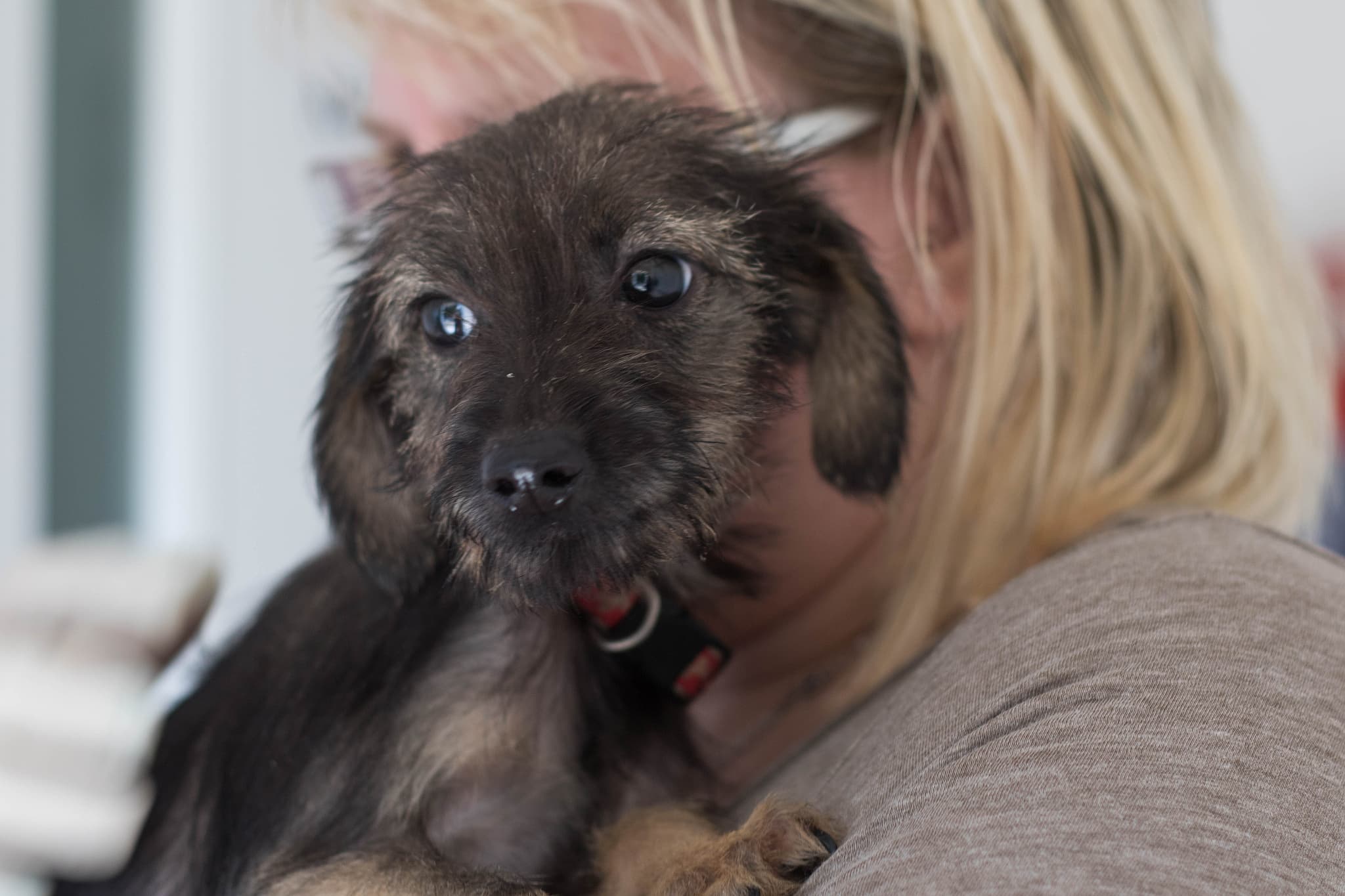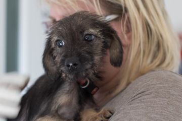 Štěně narozené cca v červnu 2016. Jedná se o křížence hrubosrstého jezevčíka, momentání váhy dvou kil (při příjmu v průměru kolem 1,2 kg) . Štěňata pochází z velmi nevhodných podmínek a tak je to na jejich vzezření a celkovém stavu znát. Rýma měla zcuchanou srst, byla silně podvyživená, začervená, zablešená, kontakt s člověkem měla minimální a o tom, že by něco uměli, to už nemůže být ani řeč.
