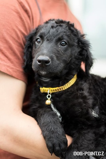 Šikula je dvouměsíční štěně, kříženec pravděpodobně curly coated retrívra. V dospělosti je tedy předpokládána velikost nad 20 kg.