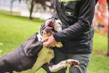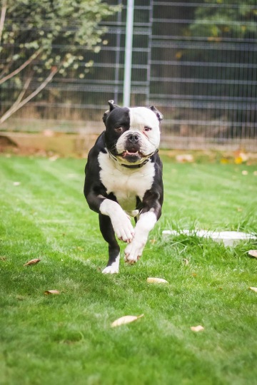 Spike je pětiletý americký buldok s 38 kily živé váhy. S lidmi nemá sebemenší problém, je to takový dobrácký trouboňouma. Je důvěřivý, mazlivý, hravý. Ošetřování Spika není problém, opakovaně jsme si to s ním vyzkoušeli. Když se rozdovádí/vzruší výrazně hůř dýchá a občas má tendence někoho obskočit, ale nevhodnost tohoto chování si nechá vysvětlit. Nevíme, jak vychází s jinými psími samci, ale při procházce ve městě se po jiných psech nesápe, jen si tak pohýkává na vodítku. V kotci je čistotný, neštěká, neničí. Umí si sednou, lehnout, hajnout, podat packu a utíkat před vámi s hračkou. Skoro aportuje.