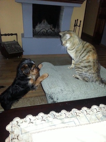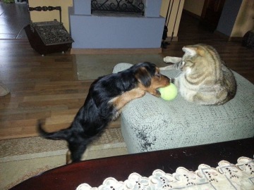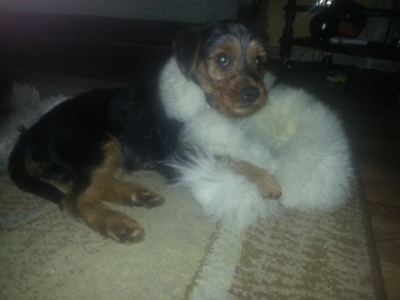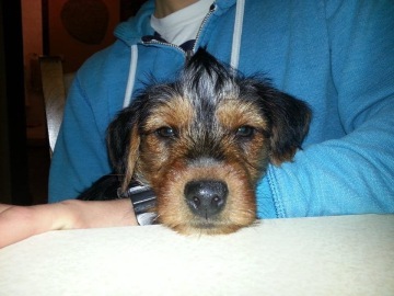Je to malinko ustrašenější štěně - prozatím se nesetkal s příliš novými podněty a na vše si teprve musí zvykat. Při seznamování se rychleji skamarádi s ženami. S kočkama se kamarádí, i když je občas rád prožene. Také jako každé štěně rád zkoumá a ochutnává. Zatím toho příliš neumí, ale má dostatek času se do dospělosti vše doučit.