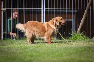 Lépe reaguje na ženy. Chůze na vodítku je prozatím bída - kousek ujde, ale jak ucítí tah, panikaří. Den ode dne se učí a zlepšuje. Je to piškoťák, miluje piškoty a za piškoty se moc snaží. Ošetřování probíhá klidně - nechá si vše líbit, neohání se, nevrčí, nekouše.