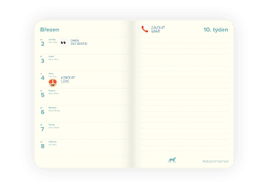 Na jedné straně je vždy kalendárium, na protější prostor pro všechny důležité poznámky. Ty navíc můžete doplnit některou ze samolepek, které jsou součástí diáře. A jako třešnička na dortu, je obrázek psa, který s vámi putuje po spodním okraji celého diáře. Vezmete příští rok pomalým krokem, nebo ho spíš proběhnete?